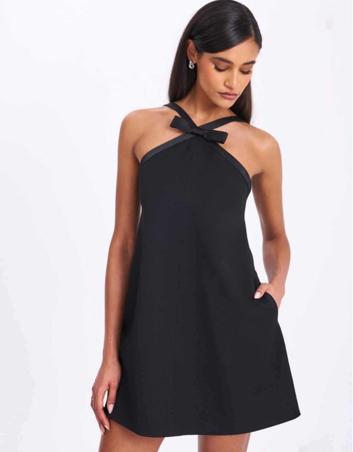 Timeless elegance with a playful twist — the AUDREY BOW MINI DRESS features a halter neckline with a delicate bow detail.